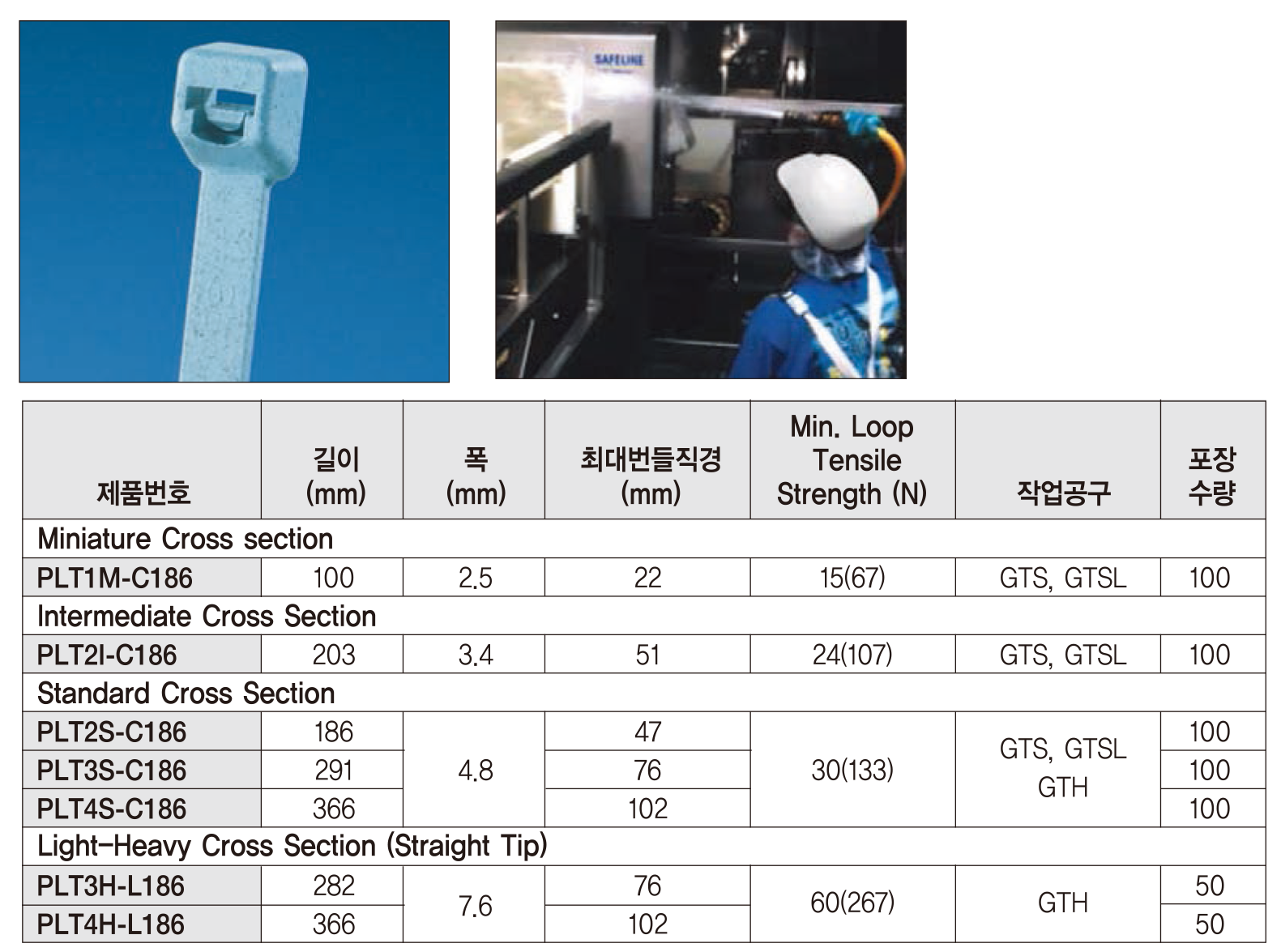 또한 진한 블루색상으로 시각적으로 검출이 용이한 팬듀이트 케이블타이입니다.