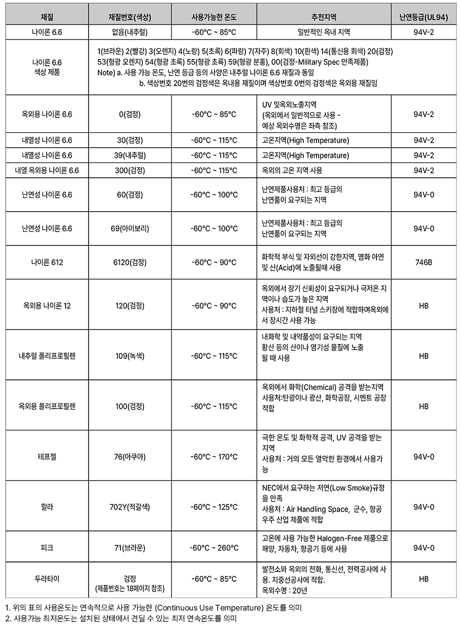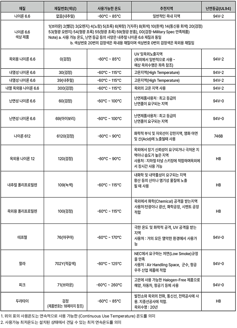 나일론(Nylon), 폴리프로필렌(PP), 테프젤(Tefzel), 할라(Halar), 피크(Peek), 아세탈 및 금속검출 케이블타이 등